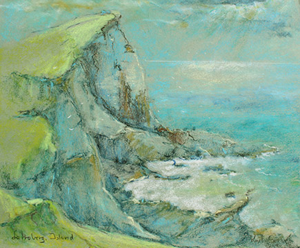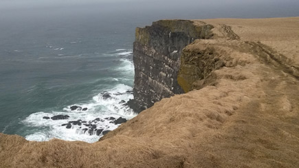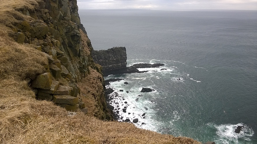 klippevæggen brat ned i havet. Det blæser stærkt i dag, så
