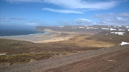 km. langt og op til 500 m. højt. Et ensomt fyr står ude til højre og