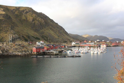 fjord. På den anden side ligger et af Lofotens mange små Fiskevær.