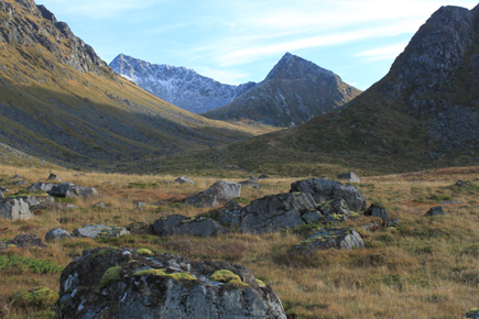 lidt læ. Jeg har sat mig ned på en stor sten. Vinden kommer raslende