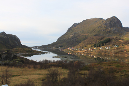 Kikker ud over den lille bugt. I baggrunden står ”Lofotvæggen” i