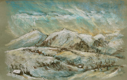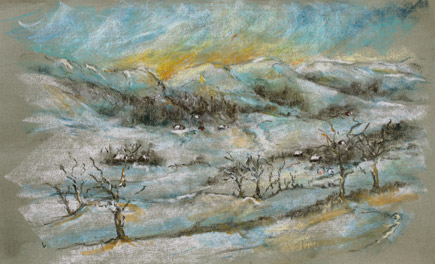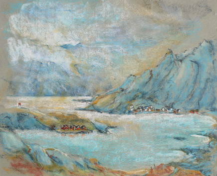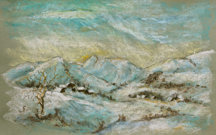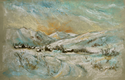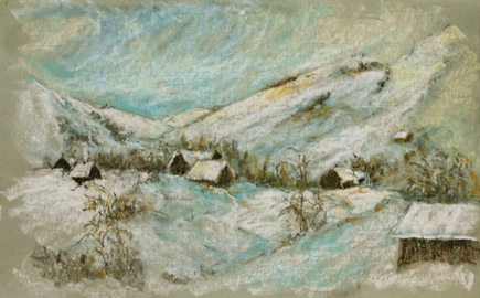imod de pastelblålige farvenuancer. De ensomme fjeldhytter klædt i